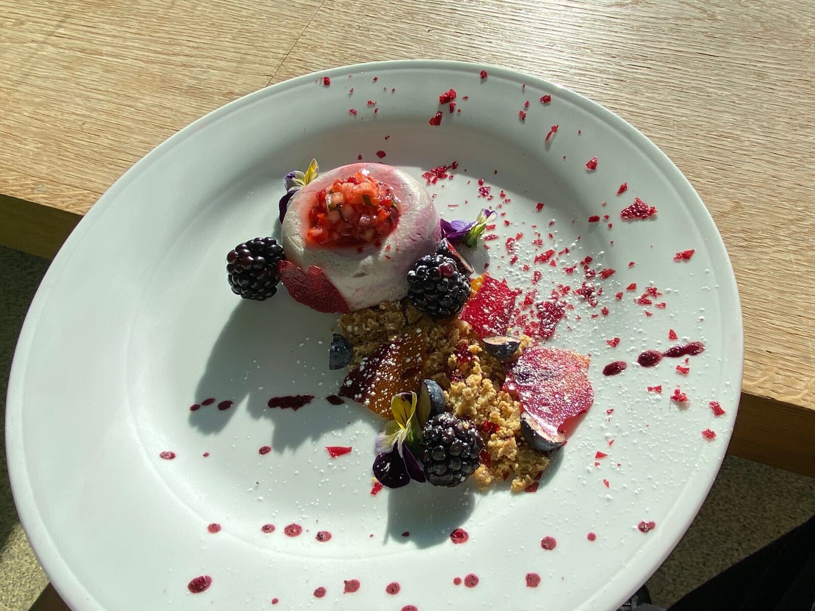 A vegan dessert that combines creamy cheesecake with date crust, topped with bright strawberry salsa. Finished with fruit leather garnish, pistachio streusel, and a vibrant blueberry coulis, it delivers a balanced blend of fruity acidity and smooth, indulgent flavor